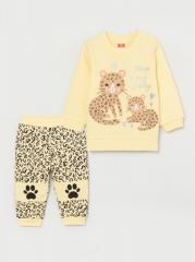 Комплект из джемпера и брюк из футера с начёсом. Джемпер гладкокрашенный, спереди декорирован принтом. В плече - застёжка на кнопки. Брюки набивные с гладкокрашенными вставками в области колен. На вставках - одноцветный принт в виде лапок. Притачная бейка горловины, манжеты и пояса джемпера и брюк - из кашкорсе с эластаном в цвет джемпера.