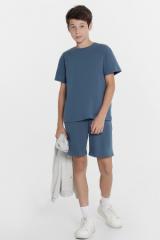 Комплект для мальчиков состоит из футболки верхней и шорт. Футболка верхняя выполнена из трикотажного кулирного полотна. Длиной до середины ягодиц. Силуэт прямой, свободный. Перед и спинка цельнокроенные. Рукава короткие, втачные. Горловина круглой формы. Обработана обтачкой из полотна трикотажного рибана. Шов притачивания обтачки по горловине спинки закрыт бейкой. Низ рукавов и джемпера обработан швом в подгибку. Шорты выполнены из трикотажного кулирного полотна. Шорты длиной до колен. На передних половинках обработаны карманы с отрезным бочком. Верхний край обработан притачным поясом из основного полотна с эластичной резиной внутри. Пояс распошит. По центру пояса пробиты петли, втянут шнур, концы шнура застрочены. Низ шорт обработан швом в подгибку.