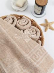 Полотенце махровое гладкокрашеное с греческим бордюром плотностью 380 гр/м2. Петля одинарная. Размер: 50х90 см. Состав: 100% хлопок. Производство: Узбекистан.