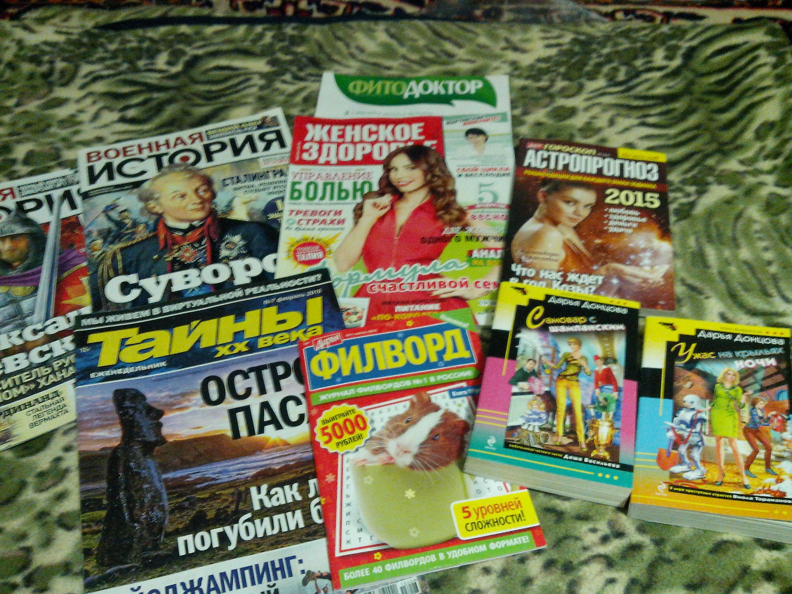 Хотелось бы поделиться своим впечатление) Спасибо организатору за его хорошую и быструю работу) И, конечно, за такую закупку, книги и журналы за копейки :hi_hi_hi: все журналы и книги в прекрасном состоянии, сразу видно, что не валялись, как старый хлам)) Никогда не видела книги за 25 рублей :-) для любителей чтения - эта закупка - рай, в книжных магазинах и магазинах с печатной продукцией цены кусаются, а в руках все таки хочется подержать книжечку или журнальчик и насладиться ими запахами перед сном) в журнале "Женское здоровье" обнаружила пробник - мелочь, а приятно) А "Загадки истории" замечательные журнальчики, особенно для тех, кто любит такую тематику, написаны доступным языком, на страничках яркие картинки, фотографии и карты)