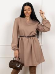 Женское платье из костюмной ткани, длиной чуть выше колена, красивым V-образным вырезом, втачным рукавом со сборкой по низу и слегка завышенной талией.