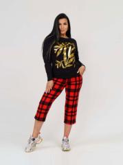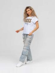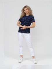 Костюм женский с брюками. Выполнен из качественного трикотажного полотна. Футболка прямого силуэта, с округлым вырезом и коротким втачным рукавом. На полочке стильный печатный рисунок. Брюки с поясом на резинке и удобными карамнами с отрезным бочком.