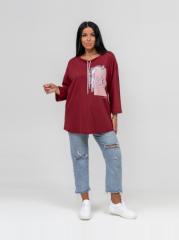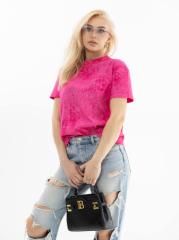 Футболка женская прямого кроя, с округлой горловиной и коротким спущенным рукавом. Материал футболки имеет яркий рисунок в стиле - варёнка.