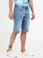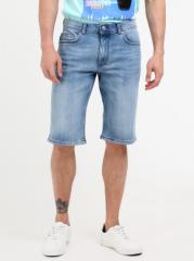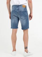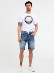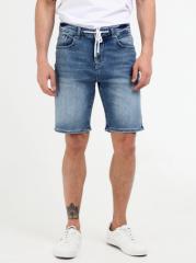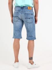 Мужские модные джинсовые шорты с пятью карманами. Посадка Regular fit (полуоблегающие по бедру), высокая талия  спереди и сзади, немного зауженные к низу. Дополнительно в поясе имеется шнур. Застежка на молнии. Выполнены из слабоэластичной ткани denim comfort stretch. Светлая стирка с потёртостями и слабовыраженными  "усами" спереди и потёртостями сзади. Параметры указаны для размера 32.