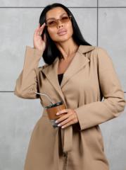 Женский брючный костюм из крепа. Верх - однобортный пиджак без подкладки, с застежкой на 3 пуговицы, втачным рукавом базового кроя и поясом кушаком. Брюки на резинке (сзади), спереди имитация гульфика и стрелки, карманы в боковых швах.