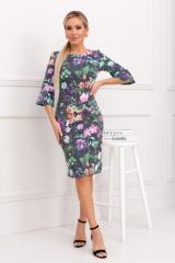 Стильное платье прилегающего силуэта из трикотажного полотна с ярким цветочным принтом. Рукава втачные ? оканчиваются воланами. Горловина круглая на внутренней обтачке. В среднем шве спинки заложена застежка на потайную молнию. Низ ровный, сзади разрез.