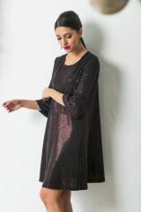 Очаровательное платье А-силуэта из трикотажного полотна с пайетками. Втачные широкие рукава ?. По спинке платье дополнено лентами из основной ткани, которые завязываются в элегантный бант. Модель на подкладе. Низ ровный, без разрезов.