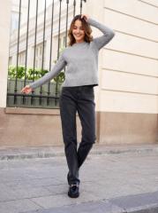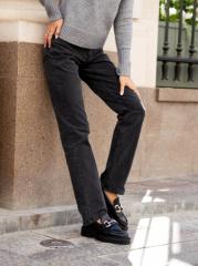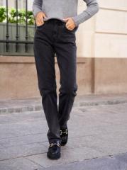 Женские классические джинсы с пятью карманами. Посадка Comfort fit (свободные по бедру). Специально завышенная талия. Для улучшения посадки по талии сделан подкройной пояс из 2-х частей. Застежка на молнии. Зауженные к низу. Выполнены из слабоэластичной ткани denim comfort stretch, цвет ткани Black/Black (лицевая и изнаночная стороны ткани черные). Темная стирка со слабовыраженными потёртостями и "усами" спереди и потёртостями сзади. Параметры указаны для размера 28. Длина внутреннего шва - 81,5 см.