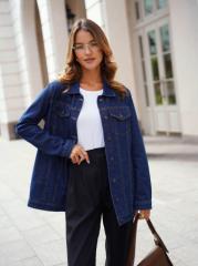 Классическая женская джинсовая куртка свободного покроя. Прямой силуэт, пройма и рукава обеспечивают комфорт и не сковывают движения; по низу рукавов манжеты, застегивающиеся на пуговицу; небольшой воротник; на груди карманы с клапаном, также застегивающимся на пуговицу; функциональные боковые прорезные карманы "в листочку"; на поясе по бокам куртки хлястик и пуговица. Выполнена из неэластичной традиционной плотной ткани denim. Классическая темная стирка.