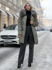 Четыре благородных оттенка коллекции осень-зима 2025 – глубокий черный, роскошный коричневый, изысканный светло-коричневый и благородный темно-зеленый – гармонично сочетаются с натуральным мехом песца. Удлиненный силуэт до колена и свободный крой идеально подходят для размеров 48-56.