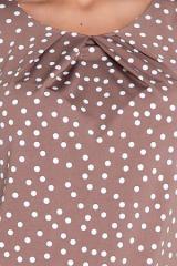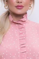 Описание: Блузка из текстильного полотна в горох. Горловина стойка с рюшей переходящая на полочку.По спинке застежка на навесную петлю и пуговицу.