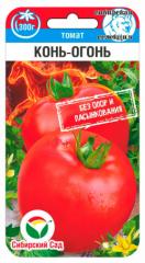 Наименование:Томат Конь-огонь 20шт серия ЛС Цена: 25 руб. Описание: Среднеранний (98-100 дней) сорт с сибирским характером для открытого и защищенного грунта от АФ «Сибирский сад». Самый первый вступает в плодоношение и непрерывно плодоносит на основном и боковых побегах до осенних холодов. Легок в уходе, сорту противопоказано пасынкование. Интересно: все побеги вверхторчащие, растут под острым углом к главной оси. Стройные растения, долго не требуют подвязки, красиво и гордо украшают гряды. Растение, высотой до 0,7м в открытом грунте, до 1,5м в теплицах. Соцветия смешанные, простые и сложные, закладываются часто и рано - через 2 листа, начиная с 4-5 листа. В кистях формируется до 13 округлых плодов розово-малиновой окраски, средней массой 160г, в теплицах некоторые плоды достигают веса 300г. Мякоть сладкая, плотная, не растрескивается. Сорт универсальный, отлично подходит для свежих салатов, засолки и консервации. Урожайность до 5кг с растения. Производитель: Сибирский сад