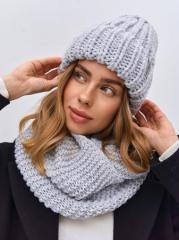 Комплект с шерстью на флисе крупной вязки  в который входит снуд и шапка.  Шапка крупной вязки с подкладкой из флиса, идеальное решение на холодную зиму. Объемный шарф-снуд можно носить как на шее, так и на голове вместо головного убора. Хит продаж!