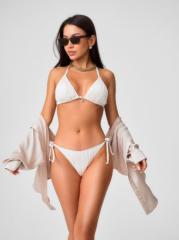 Наименование:Купальный костюм жен. Palisia молочный Цена: 1000 руб. Описание: Раздельный купальник из эластичного фактурного полона, имитирующего плиссеровку, нежного молочного цвета. Мягка чашка без каркасов, без боковых корсетных вставок, со съемными вкладышами. Середина грудки украшена нежноц подвеской, в виде жемчужины. Бретели не съемные, завязываются на шее. Эластичная лента под грудью завязывается на спинке..Плавки со средней посадкой, на подкладке, с завязками по бокам.. По линии талии и вырезу ножек подгиб и плоский шов с резинкой.