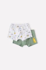 Описание: Комплект трусов-боксеров для мальчика. Сшиты из эластичного материала супрем с лайкрой. В упаковке 2 штуки: милитари с принтом + светло-серый меланж с набивкой.