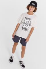 Джемпер для мальчиков свободного силуэта. Рукава втачные короткие. Горловина круглой формы. Горловина и низы рукава окантованы рибаной. Низ футболки обработан швом вподгибку на 2-ух игольной плоскошовной машине.