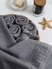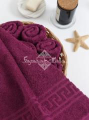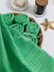 Полотенце махровое гладкокрашеное с греческим бордюром плотностью 380 гр/м2. Петля одинарная. Размер: 50х90 см. Состав: 100% хлопок. Производство: Узбекистан.