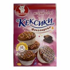 Описание: 16 шоколадных кексиков. Формочки внутри Необходимо для выпечки: 1 яйцо среднего размера, 40-50г сливочного масла или маргарина. Время выпечки: около 15 минут. В тесто можно добавить любимые ягоды или фрукты. Состав: мука пшеничная в/с, сахар, крахмал кукурузный, сода пищевая (Е500), регулятор кислотности (пирофосфат натрия (Е450)), соль, ванилин, какао-порошок