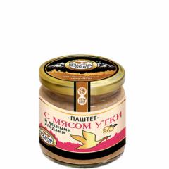 Описание: Состав: мясо утки, печень утиная, мясо куриное, масло сливочное, брусника, морковь, лук, соль, сахар, можжевеловые ягоды.