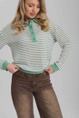Наименование:Джемпер-поло из жаккарда М325369пб Цена: 760 руб. Описание: Джемпер-поло из жаккарда пенье крученого в полоску с отделочными деталями из однотонной рибаны: притачной пояс, манжеты, воротники и планки. Джемпер объемный со спущенной проймой.