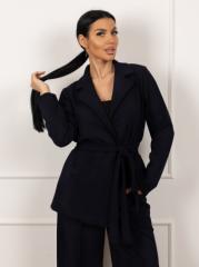 Женский брючный костюм из крепа. Верх - однобортный пиджак без подкладки, с застежкой на 3 пуговицы, втачным рукавом базового кроя и поясом кушаком. Брюки на резинке (сзади), спереди имитация гульфика и стрелки, карманы в боковых швах.