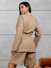 Костюм женский из льна. В составе костюма: Однобортный пиджак умеренного обьема, с базовым втачным рукавом, застежкой на 4 пуговицы и поясом-кушаком. Шорты-бермуды длиной до колена с имитацией гульфика, карманами спереди и поясом с резинкой по задней части шорт.