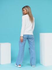 Женский костюм с брюками из 100% хлопка. Футболка со спущенной линией плеча, О-образной горловиной и накладным карманом на полочке. Широкие брюки из набивной кулирки с атласным бантом.